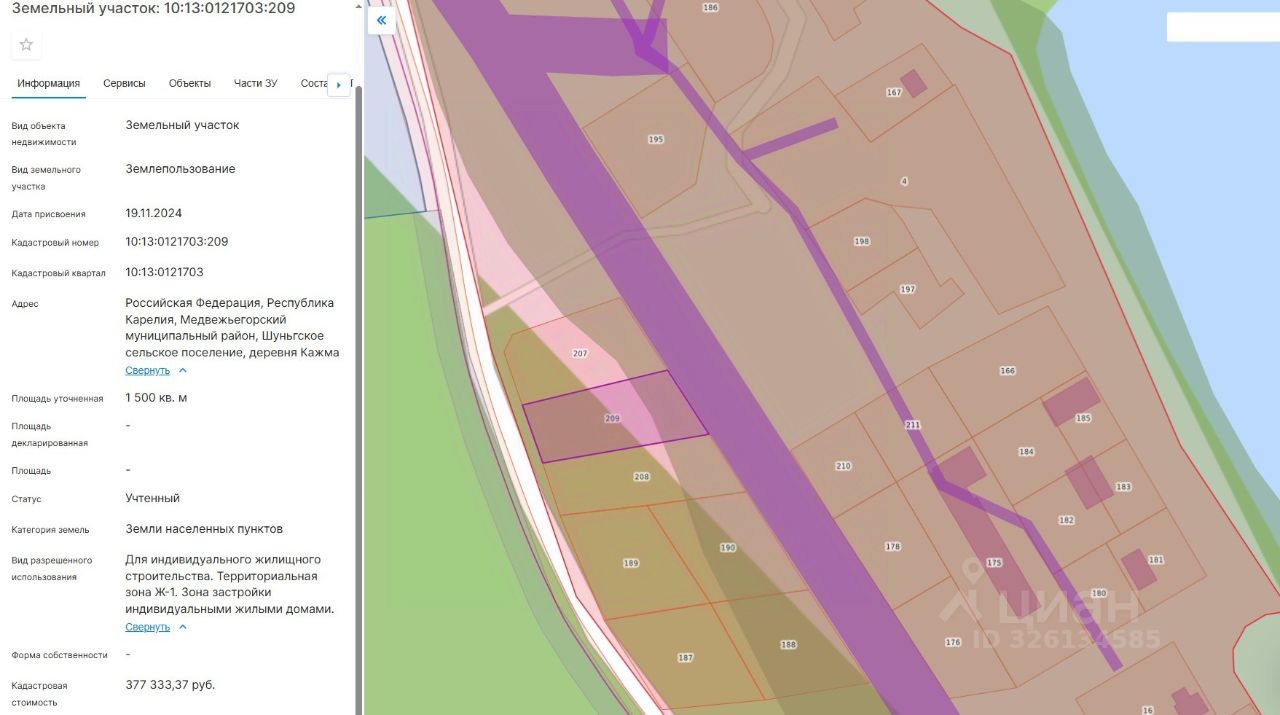 Продажа земельного участка из земель населенных пунктов, имеющего кадастровый номер 10:13:0121703:209, площадью 1500 кв.м., месторасположение: Российская Федерация, Республика Карелия, Медвежьегорский муниципальный округ, д. Кажма, вид разрешенного использования: Для индивидуального жилищного строительства. Территориальная зона- Ж-1. Зона застройки индивидуальными жилыми домами.