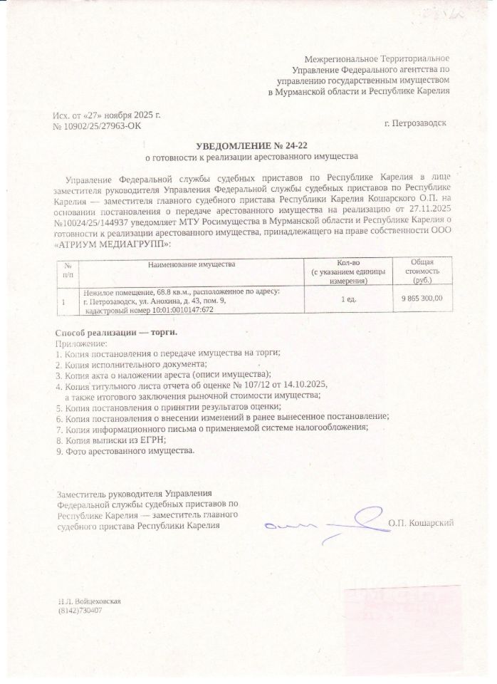 Нежилое помещение расположенное по адресу: РК, Петрозаводский городской округ, город Петрозаводск, район Центр, улица Анохина, дом 43, помещение 9, этаж 5, общей площадью 68,8 кв. м., КН 10:01:0010147:672.