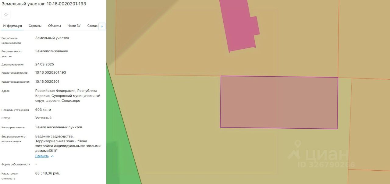 Площадь 603 кв.м, местоположение: Российская Федерация, Республика Карелия, Суоярвский муниципальный округ, деревня Совдозеро, вид разрешенного использования - Ведение садоводства. Территориальная зона - Зона застройки индивидуальными жилыми домами(Ж1).