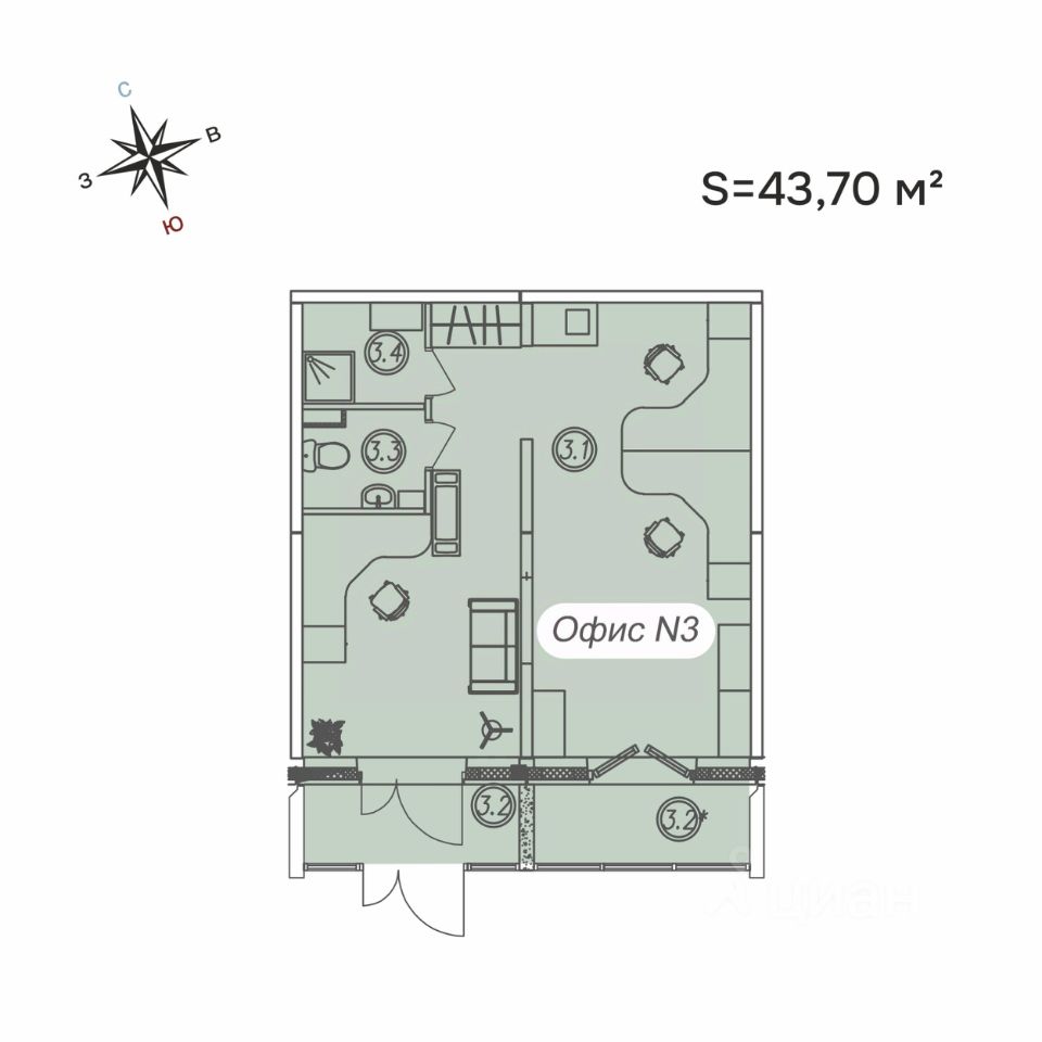 Офис 3 (площадь 43,7 м²) на 1 этаже жилого дома 2018 года(17 этажей). Компактное светлое помещение с отдельным выходом на проспект Первомайский, ремонтом, потолками 3 м и мощностью 7 кВт.
