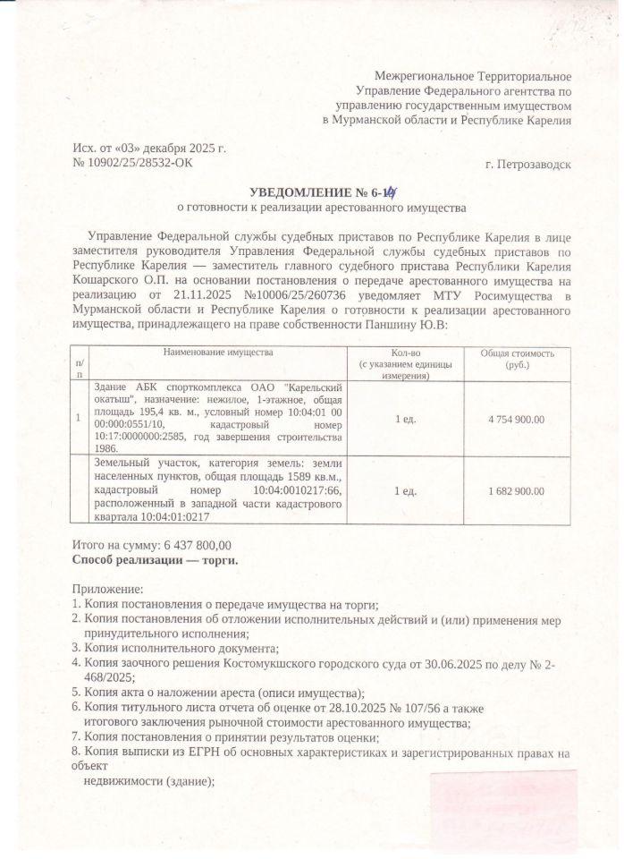 Нежилое здание АБК спорткомплекса ОАО "Карельский окатыш",1-этажное, расположенное по адресу: Республика Карелия, город Костомукша, общая площадь 195,4 кв. м., условный номер 10:04:01 0000:000:0551/10, КН 10:17:0000000:2585, год завершения строительства 1986. Вид права: собственность, ограничение прав и обременение объекта недвижимости: Запрещение регистрации 4 записи. Под зданием сформирован земельный участок, расположенный по адресу: Республика Карелия, город Костомукша, КН 10:04:0010217:66, расположен в западной части кадастрового квартала 10:04:01 02 17, категория земель: земли населенных пунктов, общая площадь 1589 кв. м. Вид разрешенного использования объекта недвижимости: по документу для эксплуатации и обслуживания нежилого здания (бани сауны). Вид права: собственность, ограничение прав и обременение объекта недвижимости: Арест 10:04:0010217:66-10/032/2018-1, запрещение регистрации 4 записи
