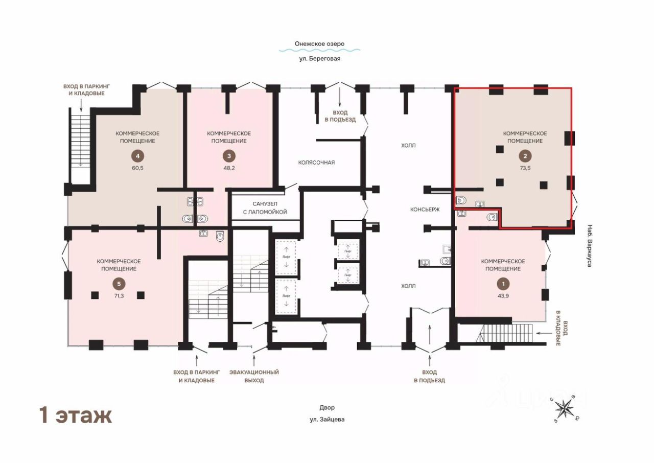 Коммерческое помещение 2 площадью 73,5 м² имеет отдельный вход со стороны ул. Варкауса и большие панорамные окна с видом на улицу, что обеспечит приток естественного света — отличное решение для бизнеса, где важна "витрина" и визуальный контакт с прохожими. Его площадь позволяет комфортно разместить торговый зал, кафе, салон услуг или офис с открытой планировкой.