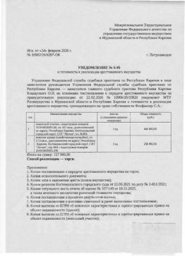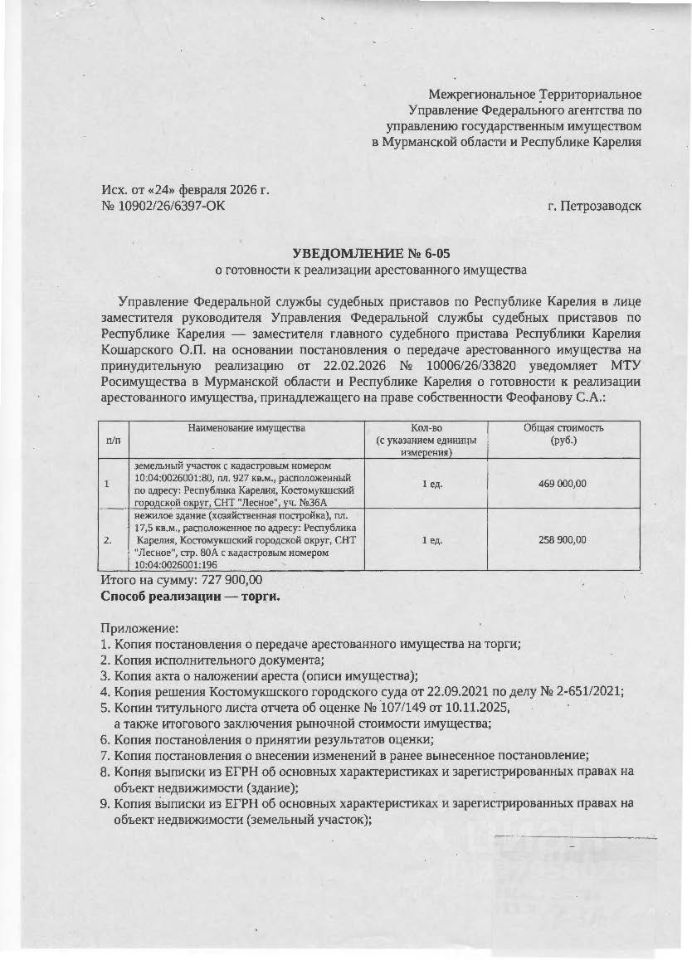 - Земельный участок, расположенный по адресу: Республика Карелия, м. о. Костомукшский, г. Костомукша, тер. СНТ Лесное, з/у 80, площадь 927 кв. м., КН 10:04:0026001:80, категория земель - земли сельскохозяйственного назначения, вид разрешенного использования - ведение садоводства, территориальная зона - СД. Зона садоводств и дачных участков. Форма собственности частная. Вид права: собственность. Ограничение прав и обременение объекта недвижимости: Прочие ограничения прав и обременения объекта недвижимости - 1 запись; Запрещение регистрации - 1 запись. Здание нежилое, расположенное по адресу: Республика Карелия, м. о. Костомукшский, г. Костомукша, тер. СНТ Лесное, стр. 80А, этаж 1, материал наружных стен -деревянные, площадь 17,5 кв. м., КН 10:04:0026001:196. Вид права: собственность. Ограничение прав и обременение объекта недвижимости: Прочие ограничения прав и обременения объекта недвижимости 10:04:0026001:196-10/032/2021-2;Запрещение регистрации 10:04:0026001:196-10/032/2025-3.