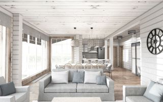 • просторная зона кухни-гостиной с панорамными окнами на озеро