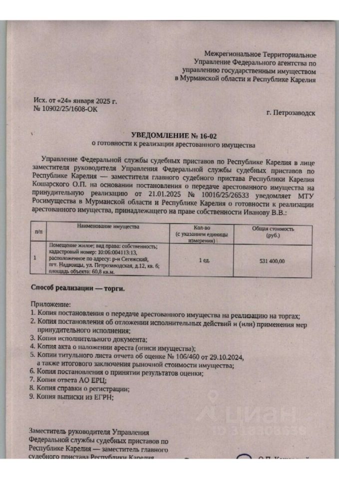 Лот 6 (Повторные торги). Помещение, жилое, КН — 10:06:0040113:13, расположенное по адресу: Республика Карелия, р-н Сегежский, пгт. Надвоицы, ул. Петрозаводская, д. 12, кв. 6, этаж — 02, площадью 60, 8 кв. м. .