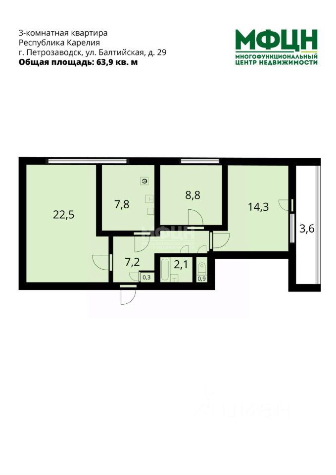 - общая площадь: 63,9 кв. м, жилая - 45,6 кв. м;
