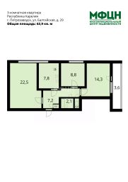 - комнаты: 22,5, 14,3 и 8,8 кв. м;