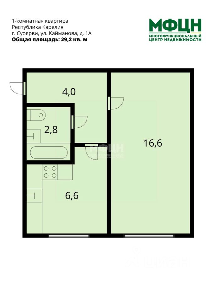 - общая площадь: 29,2 кв. м, жилая: 16,6 кв. м;