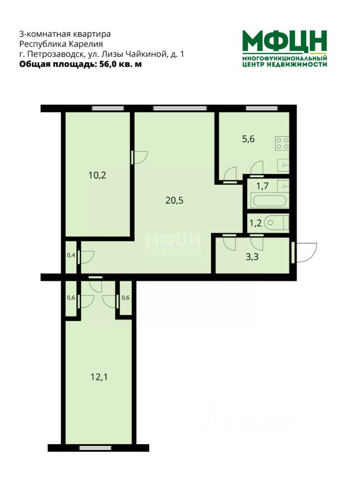 К покупке предлагается 3 - комнатная квартира, расположенная на 5-м этаже 5 - этажного дома, находящаяся по адресу: Петрозаводск, улица Лизы Чайкиной, дом 1.