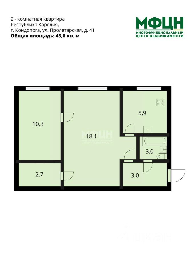 К покупке предлагается 2 - комнатная квартира, расположенная на 1 - м этаже 5 - этажного дома, находящаяся по адресу: Республика Карелия, г. Кондопога, ул. Пролетарская, дом 41.