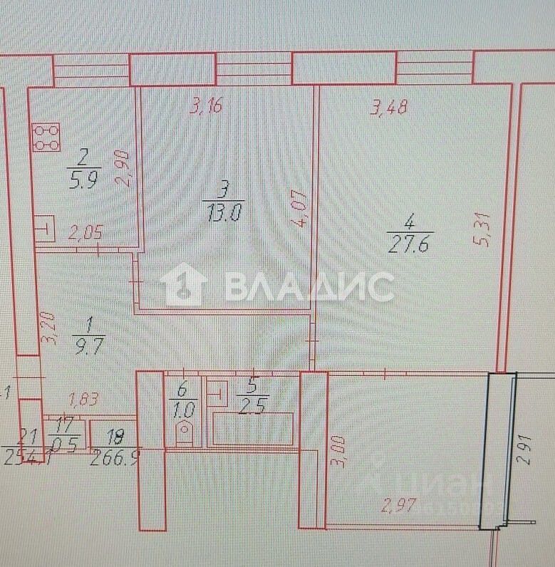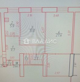 Здесь просторные комнаты (13 кв. м и 27,6 кв. м), общая жилая площадь составляет 40,6 кв. м, а площадь кухни — 5,9 кв. м.