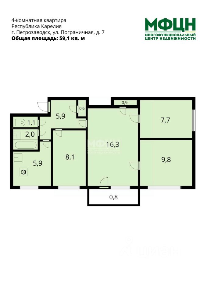 - большая площадь квартиры: 59,1 кв. м + балкон;