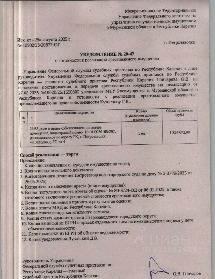 Лот 6. 22/68 доли в праве собственности на жилое помещение, площадью — 67, 8 кв. м, расположенное по адресу: Республика Карелия, г. Петрозаводск, ул. Зайцева, д. 37, кв. 4, КН 10:01:0030105:297, этаж 2, форма собственности частная. Вид права общая долевая собственность.