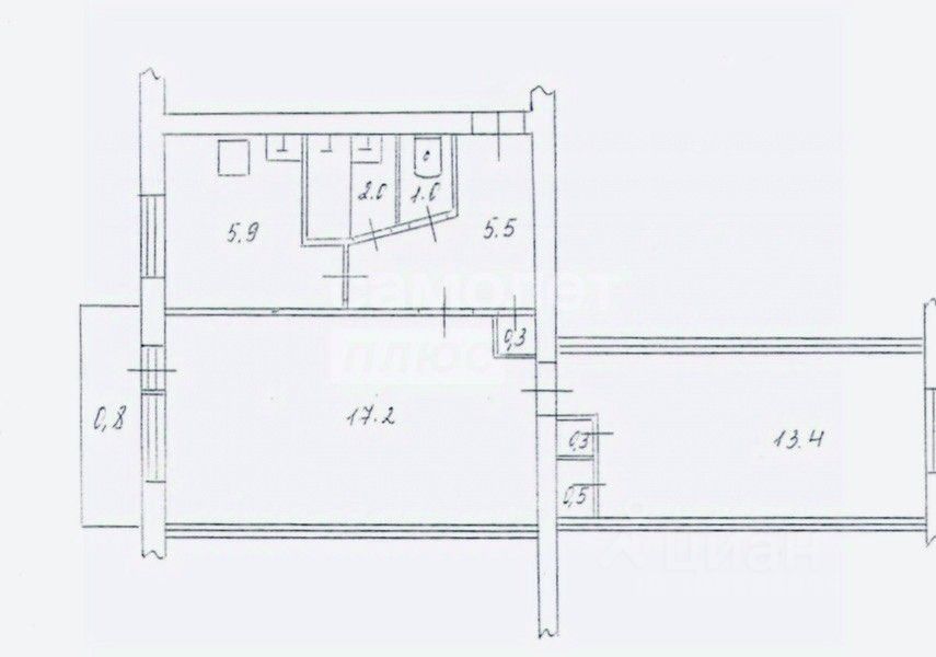 Общая площадь квартиры — 46,1 м². Комнаты занимают 17,2 и 13,4 м². Кухня — 5,9 м², прихожая — 5,5 м². Санузел раздельный: 2 м² для ванной и 1 м² для туалета. Есть балкон — 0,8 м².