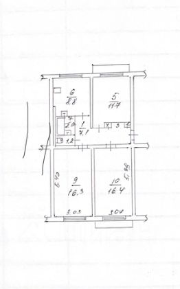 Общая площадь составляет 64,3 м2, из которых жилая 44,4 м2 (16,4+16,3+11,7), кухня 8,8 м2, совмещенный с/у. Квартира расположена на пятом этаже пятиэтажного панельного дома, построенного в 1981 году. Высота потолков 2,5 метра.