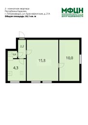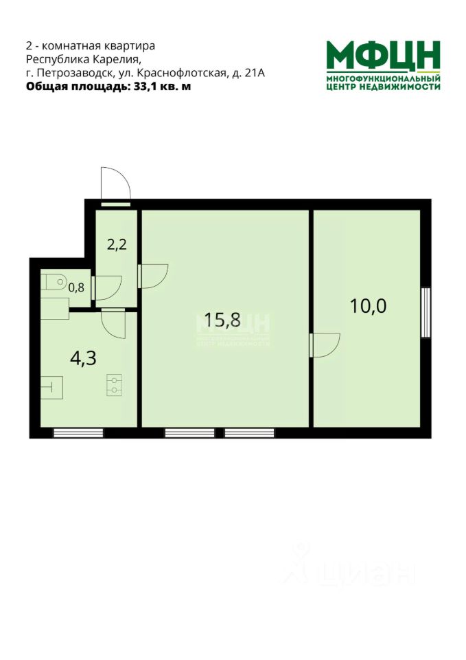 - общая площадь: 33.1 кв. м, жилая: 25.8 кв. м;