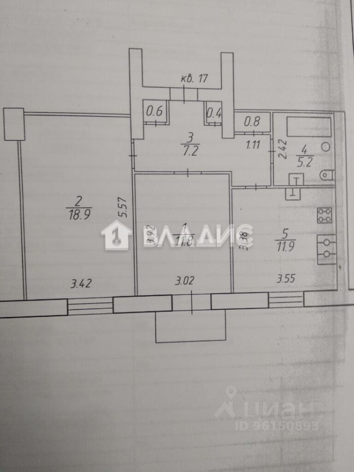 Общая площадь квартиры составляет 56,8 кв. м, из которых 30,7 кв. м — жилая площадь.