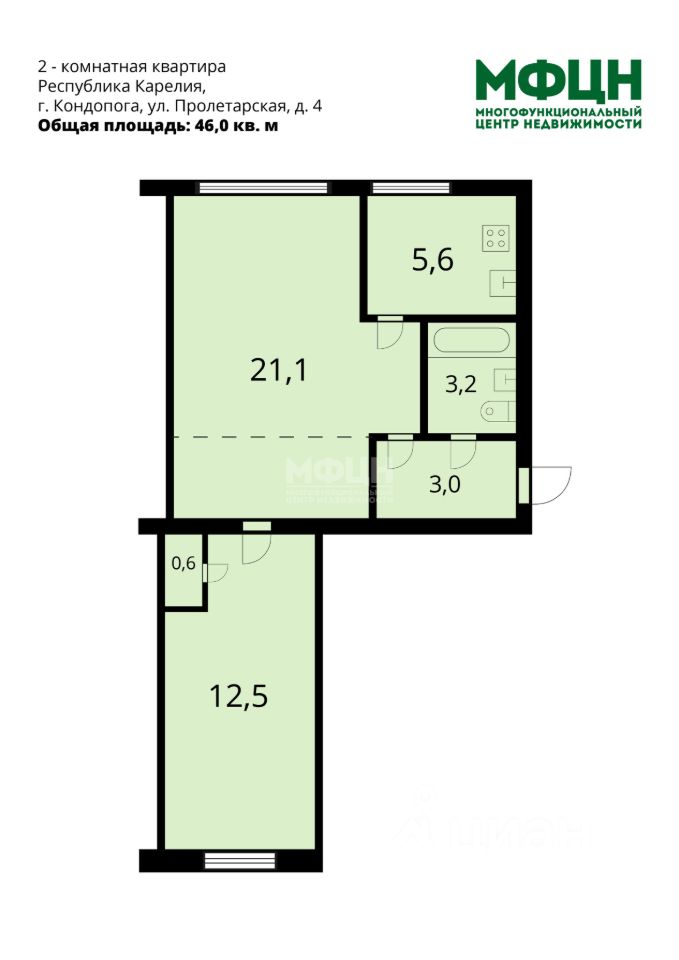 - общая площадь: 46,0 кв. м, жилая: 33,6 кв. м;