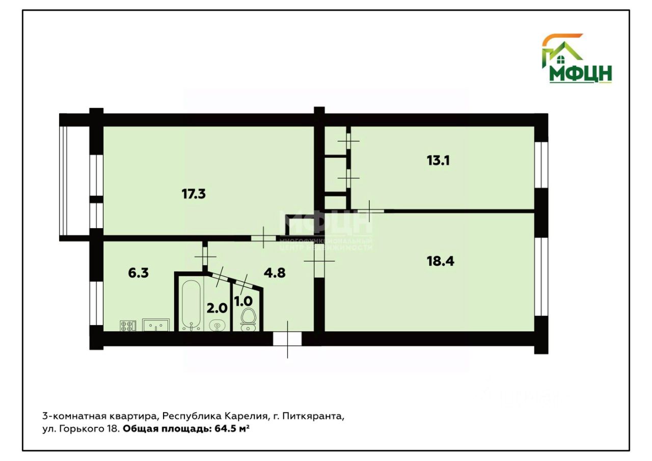- комнаты: 18,4; 17,3 и 13,1 кв. м;