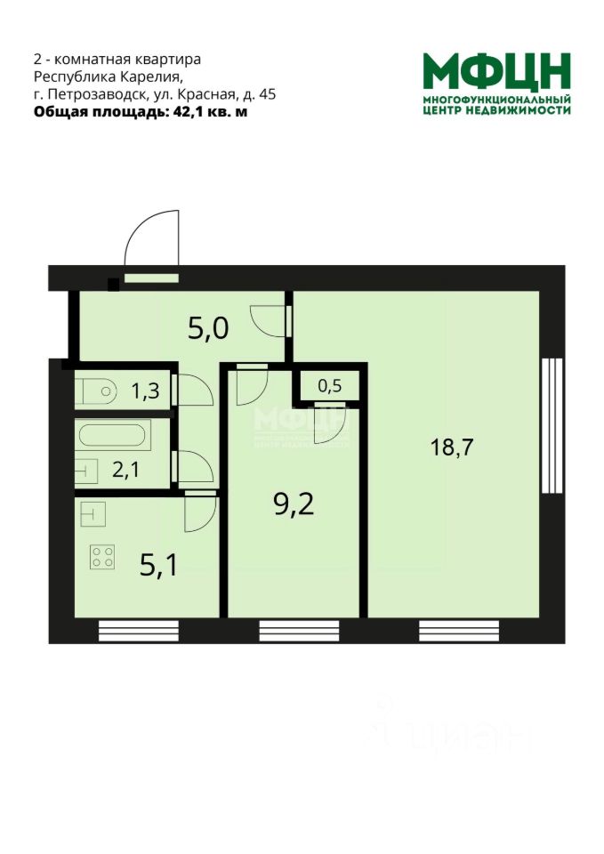 - общая площадь: 42,1 кв. м, жилая: 27,9 кв. м;