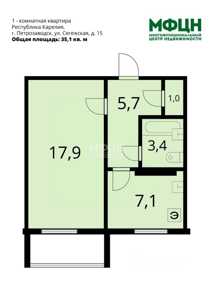 - общая площадь: 35,1 кв. м, жилая: 17,9 кв. м;
