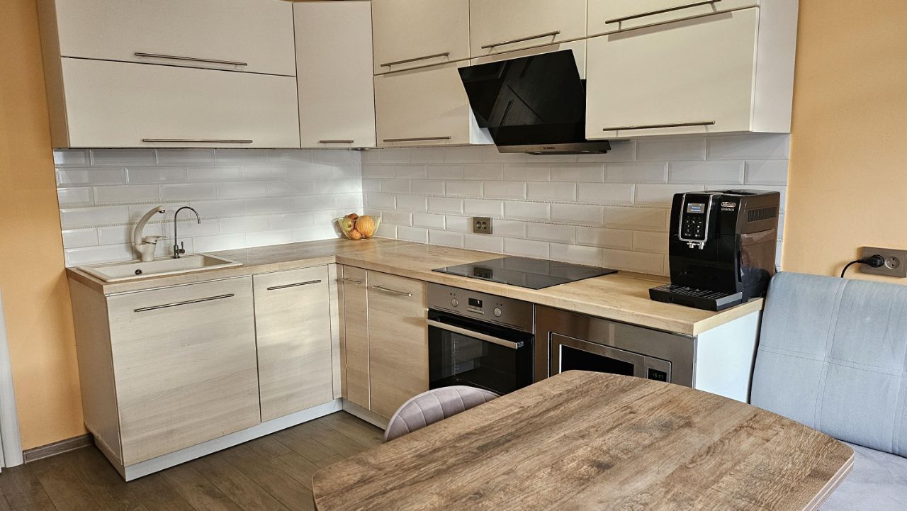 Отдельная кухня площадью 13 кв.м., встроенная кухня с бытовой техникой (кухня остается), полы керамогранит с подогревом, натяжные потолки.