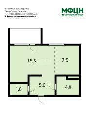 - общая площадь: 33.8 кв. м, жилая: 15.5 кв. м;