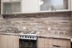 На кухне установлена современная кухня, выполненная по индивидуальному заказу с подсветкой рабочей зоны и рейлингами для кухонной утвари. Имеется встроенная вытяжка.