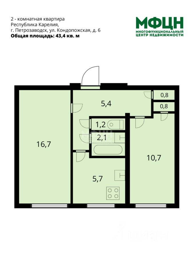 - общая площадь: 43,4 кв. м, жилая: 27,4 кв. м;
