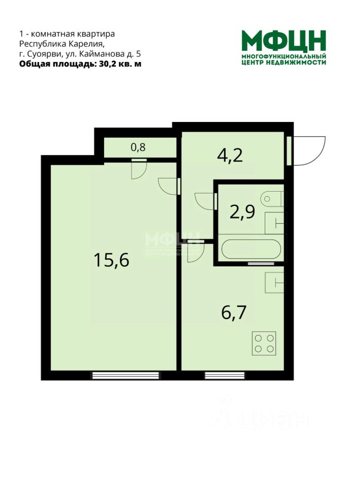 - общая площадь: 30,2 кв. м, жилая: 15,6 кв. м;