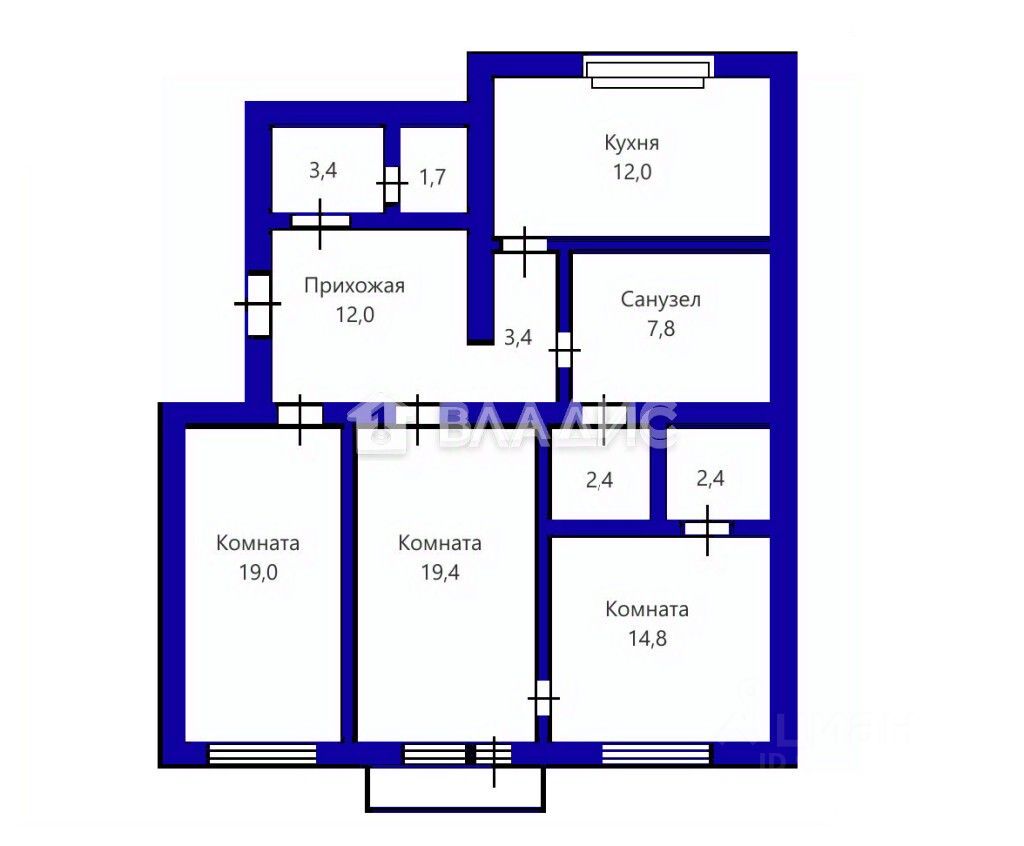 - Кладовые помещения: 3,4 + 1,7 + 2,4 кв.м.