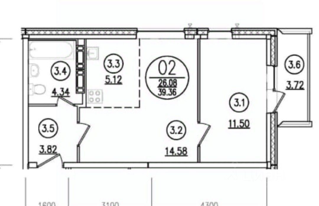 комнаты 14.5, 11.5, кухонная зона 5.1м2;