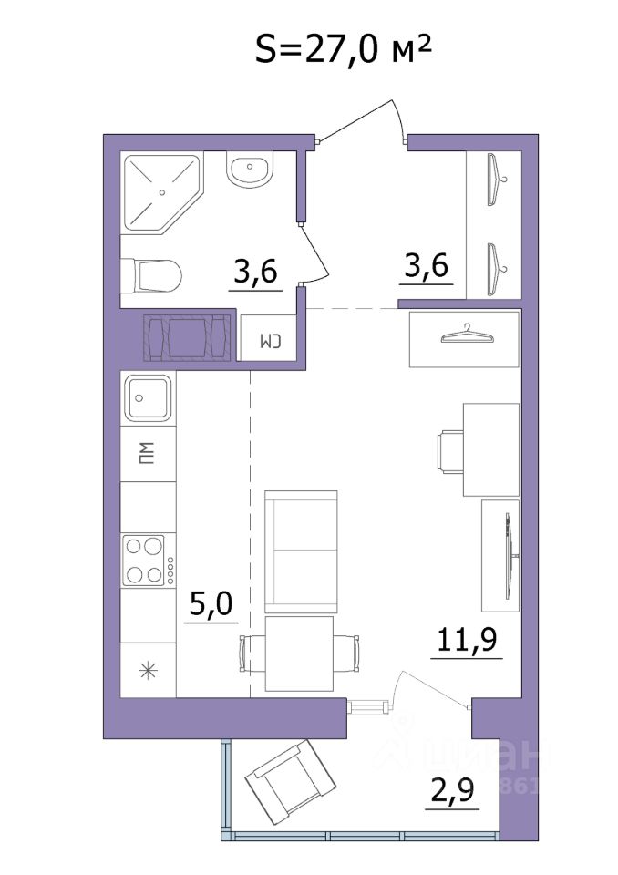 Продаётся студия в строящемся доме (Дом 2), срок сдачи: II-кв. 2028, общей площадью 27 кв.м., на 12 этаже.