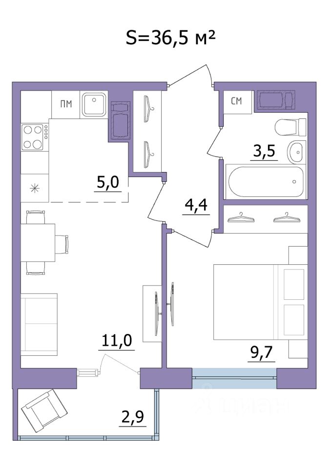 Продаётся 2-комнатная квартира в строящемся доме (Дом 2), срок сдачи: II-кв. 2028, общей площадью 36.5 кв.м., на 4 этаже.