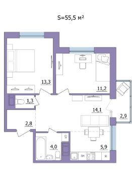 Продаётся 3-комнатная квартира в строящемся доме (Дом 2), срок сдачи: II-кв. 2028, общей площадью 55.5 кв.м., на 12 этаже.
