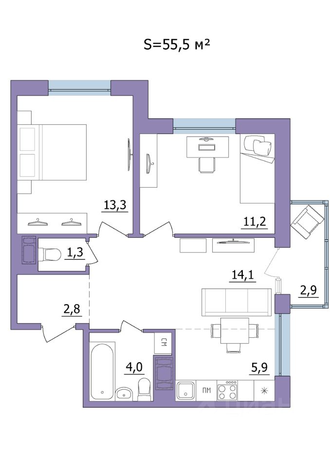 Продаётся 3-комнатная квартира в строящемся доме (Дом 2), срок сдачи: II-кв. 2028, общей площадью 55.5 кв.м., на 13 этаже.
