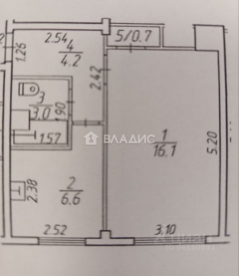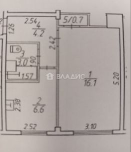 Квартира общей площадью 30,6 кв. м, жилая площадь составляет 16,1 кв. м, кухня — 6,6 кв. м.