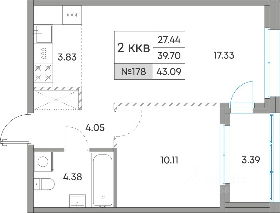 Общая площадь43,09 м²