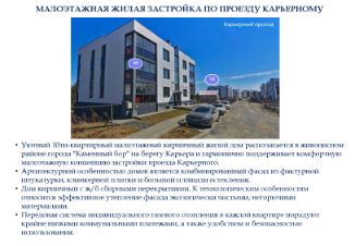 Уютный 10ти-квартирный 3х-этажный кирпичный жилой дом расположен в живописном районе города "Каменный бор" на берегу Карьера и гармонично поддерживает комфортную малоэтажную концепцию застройки проезда Карьерного.