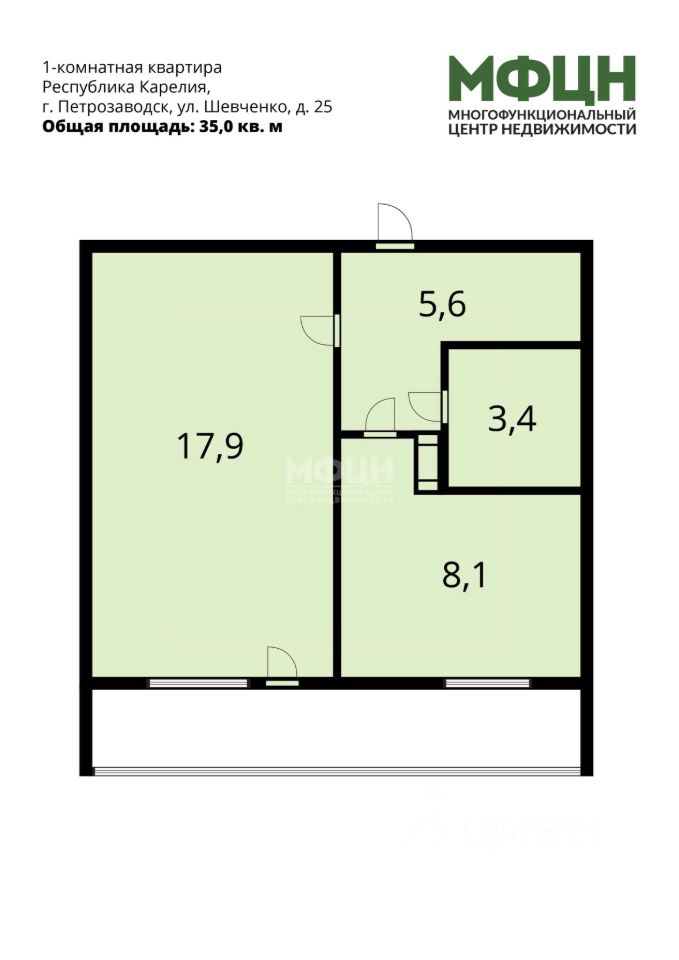 - общая площадь: 35 кв. м, жилая: 17,9 кв. м;