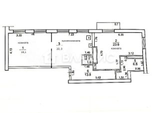 В квартире два совмещённых санузла и одна лоджия.