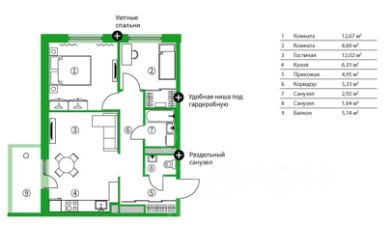 Очень удачная эргономичная планировка (в объявлении она есть), все помещения правильной формы, просторная кухня-гостиная с выходом на просторную лоджию, и 2 отдельные комнаты, санузел раздельный, окна на север и на запад.