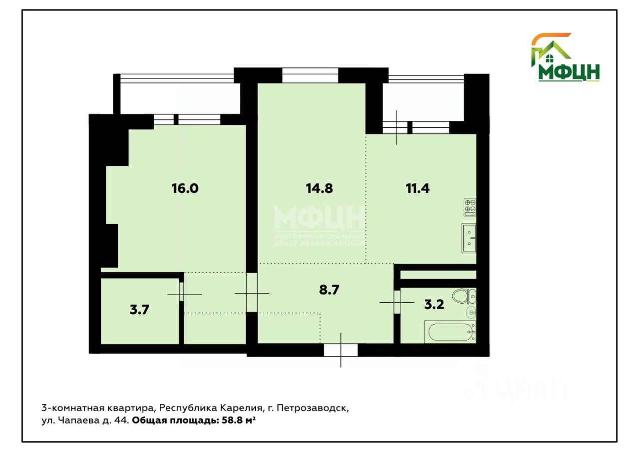 общая площадь: 58,8 кв. м, жилая: 32,5 кв. м;
