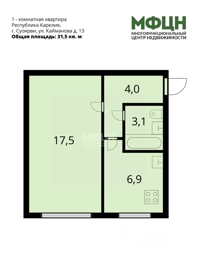 К покупке предлагается 1 - комнатная благоустроенная квартира, расположенная на 3-м этаже 5 - этажного дома, находящаяся по адресу: город Суоярви, ул. Кайманова, дом 13.
