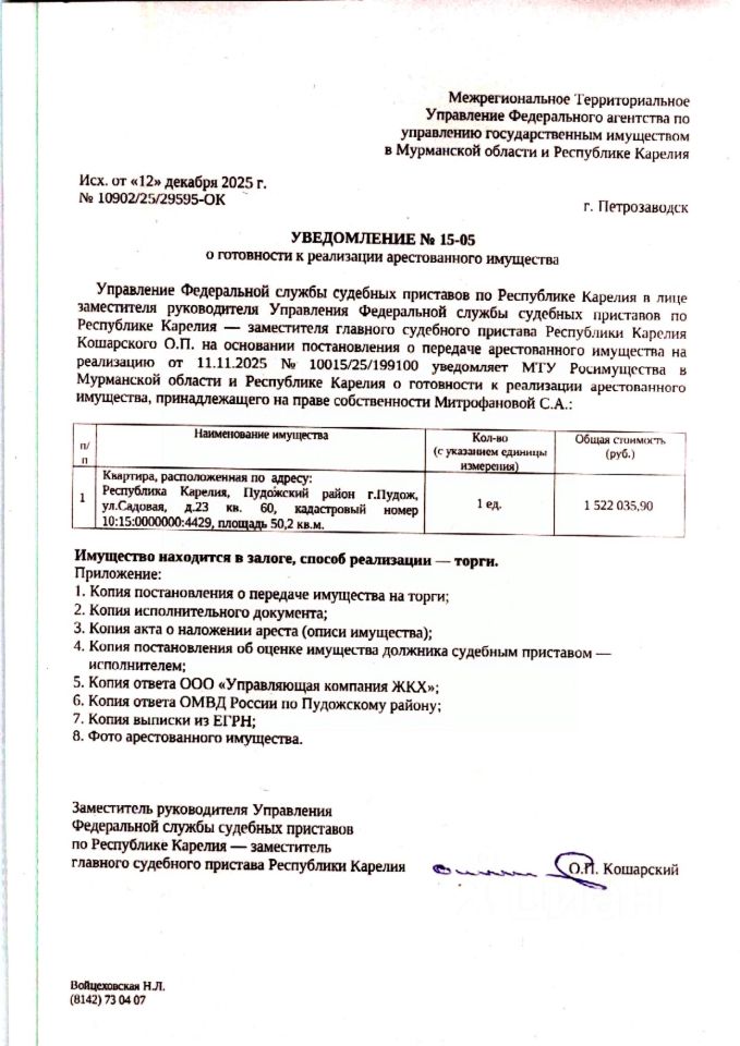 Квартира площадью 50,5 кв. м., КН 10:15:0000000:4429, расположенная по адресу: РК, Пудожский р-н, г. Пудож, ул. Садовая, д. 23 кв. 60 этаж 5. Вид права: общая долевая собственность (Митрофанова С.А. ин/л Митрофанов С.А. 2023г.р). В квартире зарегистрировано 2 человека, в т.ч. 1 несовершеннолетний. Задолженность по КР на 10.11.2025 составляет 19 502,28 руб. Находится в залоге.