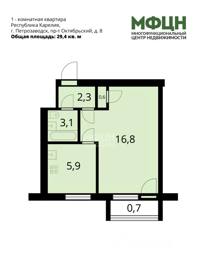 - общая площадь: 29,4 кв. м, жилая: 16,8 кв. м;