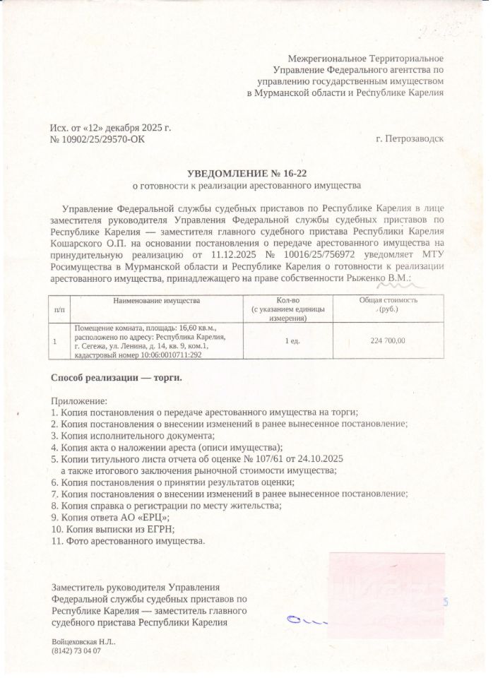 Помещение, жилое, КН - 10:06:0010711:292, расположенное по адресу: Республика Карелия, Сегежский муниципальный район, Сегежское городское поселение, город Сегежа, улица Ленина, дом 14, квартира 9, комната 1, этаж 04, площадью 16,6 кв. м. зарегистрирован 1 чел, задолженность по взносам на капитальный ремонт на 02.12.2025 г составляет 5939,48 руб., пени 670,17 руб.