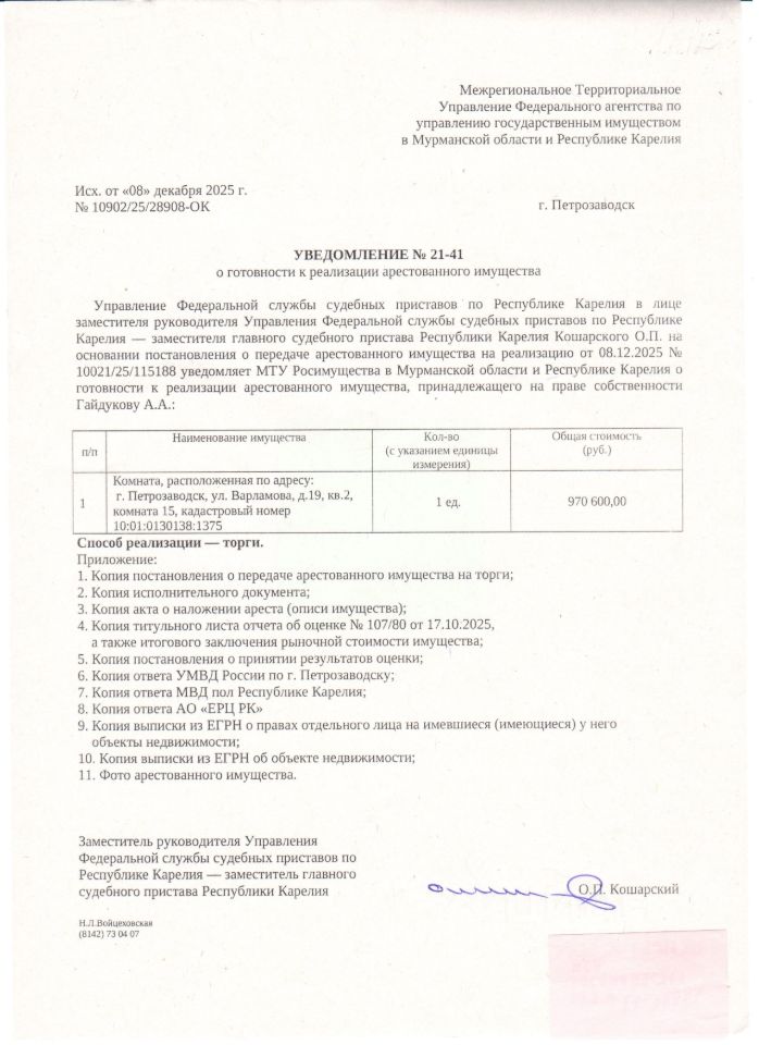 Жилое помещение комната, расположенная по адресу: РК, город Петрозаводск, улица Варламова, дом 19, квартира 2, комната 15, этаж 02, площадью 12,6 кв. м., КН 10:01:0130138:1375. Вид права: собственность, ограничение права и обременение объекта недвижимости: Запрещение регистрации 11 записей. Зарегистрирован 1 чел. Задолженность по уплате взносов на капитальный ремонт по состоянию на 01.12.2025 г. составляет 4848,73 руб.