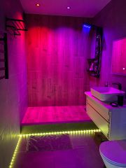 Kвартира оснащена функцией умного дома, управление голосом или телефоном: освещением/подсветками (rgb, диммируемый), теплыми полами, робот-пылесосом, музыкой, телевизором, посудомоечной и стиральной машиной. Подогрев полов предусмотрен в коридоре, кухне и сан узле с сенсорными датчиками.