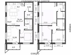 Продаётся 3-комнатная квартира в строящемся доме (Дом 10), срок сдачи: I-кв. 2028, общей площадью 61.75 кв.м., на 17 этаже.